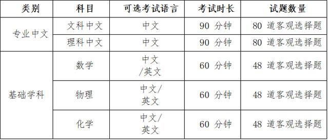 CSCA 采用“必考+选考”的组合模式,其考试科目共5门,分为两大类别:专业中文与基础学科。请参考下表了解详细信息: