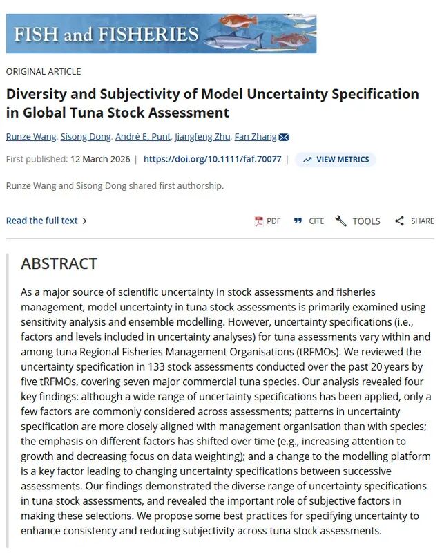 Recently, The research group of Professor Zhang Fan from Shanghai Ocean University, together with the Distant-water Fisheries International Compliance Team, in collaboration with teams including the University of Washington, USA, has made new progress in research on model uncertainty specification in global tuna stock assessment. The findings have been published in the top fisheries journal Fish and Fisheries under the title Diversity and Subjectivity of Model Uncertainty Specification in Global Tuna Stock Assessment. Wang Runze, a master's student (Class of 2024) from Shanghai Ocean University, and Dr. Dong Sisong, a postdoctoral researcher, are co-first authors of the paper, with Professor Zhang Fan as the corresponding author. This study was supported by the National Natural Science Foundation of China (Grant No. 32373132) and the Global Important Fish Species Monitoring Project, and relied on the guarantees provided by research platforms including the 'Double First-Class' construction of the Fisheries Discipline at Shanghai Ocean University and the National Engineering Research Center for Oceanic Fisheries.