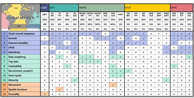 金枪鱼是全球最重要的海洋渔业资源之一,其可持续开发依赖科学的资源评估。然而,不同的区域渔业管理组织在评估金枪鱼时,采用的模型假设和不确定性设置存在明显差异。研究团队通过梳理过去二十余年的一百余份金枪鱼评估报告,分析了五大区域渔业管理组织中的七种主要金枪鱼的评估数据(图1),首次系统量化了评估模型不确定规范的差异及其主观性在评估中的影响,为国际渔业管理提供了新的科学依据。