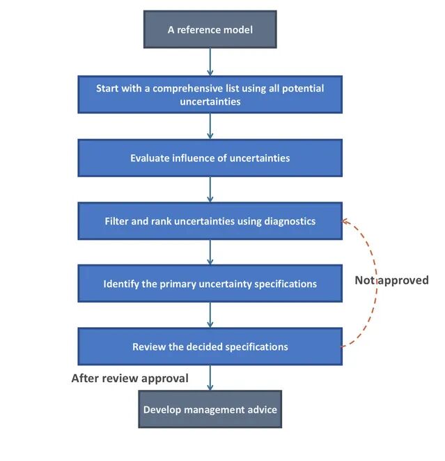 这一研究成果为国际渔业管理提供了重要启示:在制定管理措施时,应充分考虑模型不确定性设置的动态变化。研究建议通过跨组织协调和专家审查,提高评估方法的一致性和透明度;同时建立标准化的“不确定性清单”,确保评估中所有潜在不确定性得到合理考虑,并减少评估人员主观偏好对结果的影响。此外,团队还提出了一套评估模型最佳实践指南(图4),通过流程化方式指导不确定性设置的系统选择和设定,为未来的科学管理提供制度化保障。